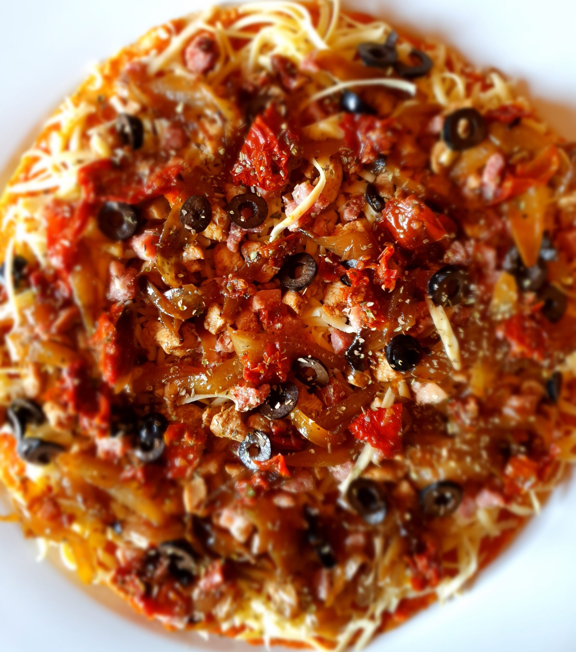 Home-made base with tomato sauce, Chicken, Bacon bits, Sundried tomato, onions, mozzarella and olives.